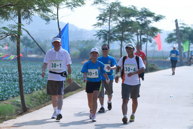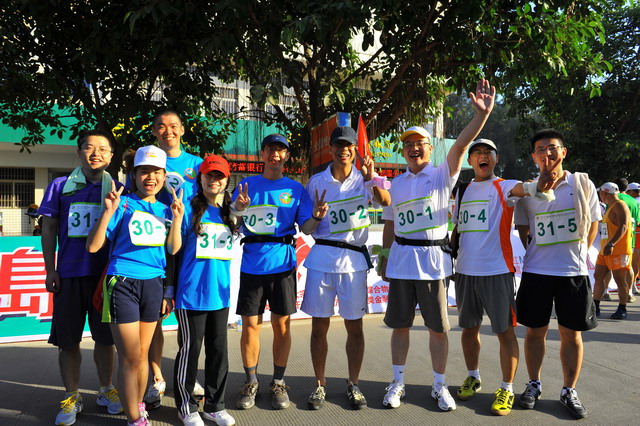 11月5日,秋陽(yáng)燦爛,大家早已躍躍欲試,隊(duì)中負(fù)責(zé)后勤的我,早在比賽前夕就廣發(fā)注意帖:速干短褲、帽子、腰包、水杯、小方巾、鞋子等物品需必備;作為隊(duì)伍領(lǐng)頭雁的齊總則早已咨詢專(zhuān)業(yè)選手,提倡大家結(jié)合自己體力準(zhǔn)備能量棒、巧克力等緊急能量品;隊(duì)長(zhǎng)鄧總在了解路線和路況后,制定了“穩(wěn)重取勝”的戰(zhàn)略,采取了“準(zhǔn)備活動(dòng)做充足,先慢后快求適應(yīng),不因外因亂陣腳,敵疲我追求成績(jī)”的具體戰(zhàn)術(shù);隊(duì)伍中的另一名隊(duì)員則帶來(lái)了他專(zhuān)業(yè)的GPS定位手表,分時(shí)段匯報(bào)所走路程、當(dāng)前速度適當(dāng)與否,并提前告知提速準(zhǔn)備;我們的女隊(duì)友亞梅,則一路保持微笑,緊跟隊(duì)伍,偶爾爆出的一些冷笑話,讓緊張趕路的我們倍感清爽。