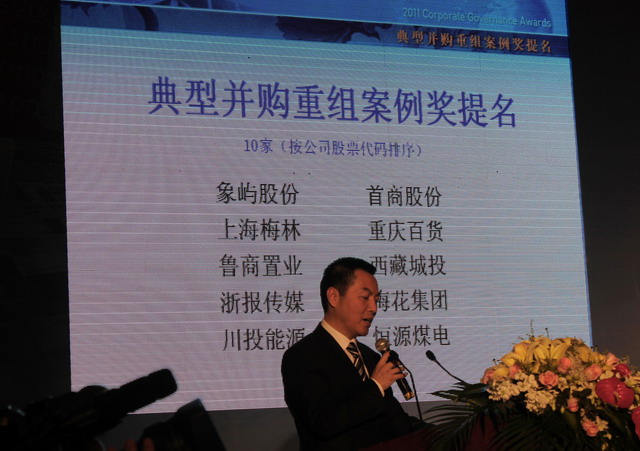 2011年12月19日,由上海證券交易所主辦、國(guó)務(wù)院國(guó)資委和經(jīng)濟(jì)合作與發(fā)展組織(OECD)共同支持的第十屆中國(guó)公司治理論壇在上海召開(kāi)。中國(guó)證監(jiān)會(huì)主席郭樹清、上海市委副書記、市長(zhǎng)韓正、上海市委常委、副市長(zhǎng)屠光紹等領(lǐng)導(dǎo)出席論壇并給獲得公司治理專項(xiàng)獎(jiǎng)的各獲獎(jiǎng)上市公司頒獎(jiǎng)。象嶼集團(tuán)副總裁、象嶼股份副董事長(zhǎng)陳方代表公司應(yīng)邀出席論壇。今年,象嶼股份因其在歷時(shí)2年多的破產(chǎn)重整和資產(chǎn)重組中的優(yōu)良表現(xiàn)和創(chuàng)新而獲得“典型并購(gòu)重組案例獎(jiǎng)”提名。此獎(jiǎng)項(xiàng)代表著業(yè)界和上交所對(duì)于象嶼股份成功借殼上市的肯定和贊賞。