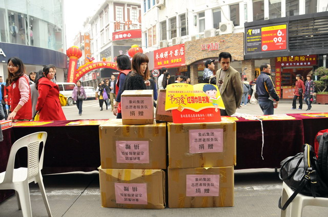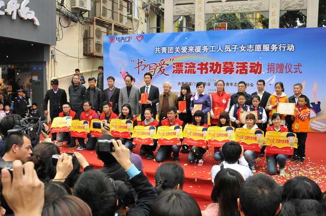 3月4日下午,在中山路步行街的活動現場,集團的志愿者們將整理好的六大箱愛心圖書贈送給了來廈務工人員子弟學校,并參加了現場的“書寫愛”漂流書勸募活動,向社會傳遞我們象嶼人的公益和愛心。