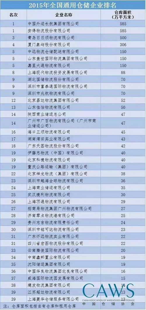 該榜單由中國倉儲協(xié)會根據(jù)企業(yè)自愿申報和調(diào)查掌握的行業(yè)數(shù)據(jù),以2015年底企業(yè)自有和租用倉庫設(shè)施的總規(guī)模為依據(jù),共排出全國倉儲企業(yè)100強,其中包括“通用倉儲企業(yè)40強”、“倉儲地產(chǎn)企業(yè)10強”、“冷藏倉儲企業(yè)30強”、“危化品倉儲企業(yè)10強”和“危化品儲罐企業(yè)10強”。