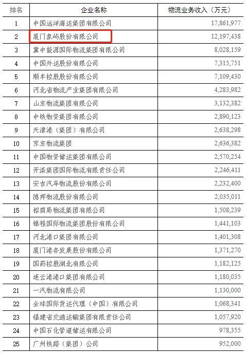 11月23日,中國物流與采購聯合會公布了2018年度中國物流企業50強排名,象嶼股份位列第2,較上一年前進兩位。