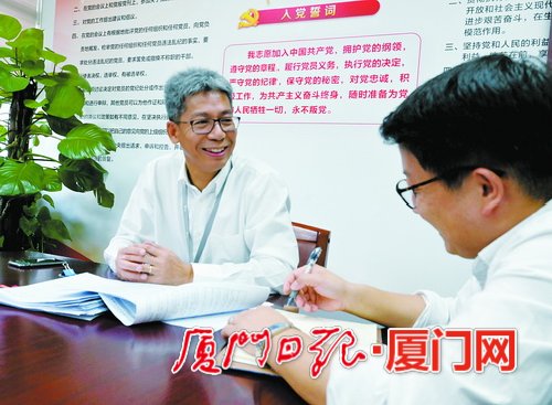象嶼股份黨委副書記、副總經理齊衛東(左)跟員工探討項目落實情況。(《廈門日報》記者 黃曉珍 攝)