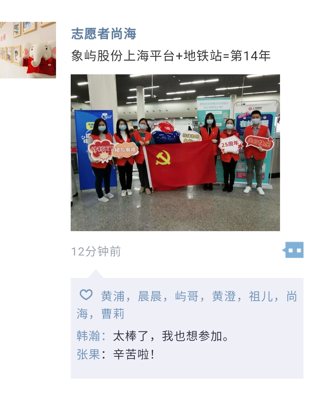 這是象嶼股份上海平臺志愿者走進地鐵站的第14個年頭。作為城市文明的先行者和宣傳者,志愿者們十四年如一日,堅持用真誠主動的服務為出行的乘客送上溫暖,讓“象嶼紅”成為地鐵站里一道亮麗的風景線。