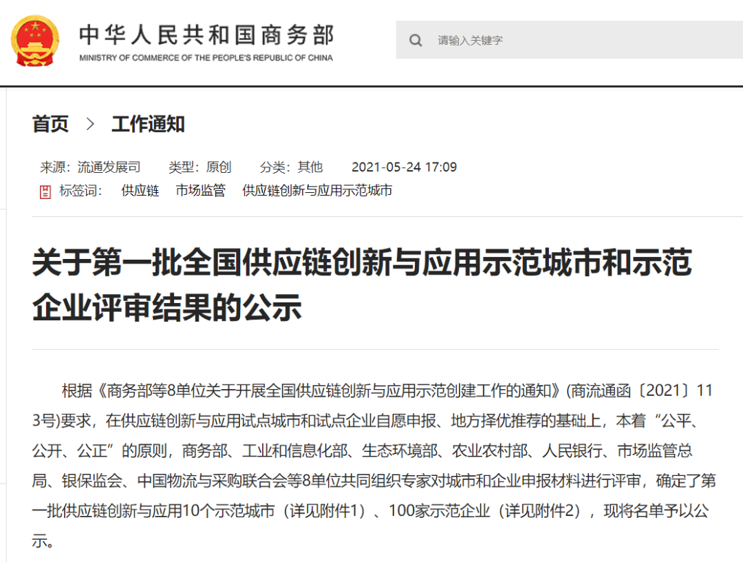 商務部此次公示的“全國供應鏈創新與應用示范城市和示范企業評審結果”,是商務部、工業和信息化部、生態環境部、農業農村部、人民銀行、市場監管總局、銀保監會、中國物流與采購聯合會等8單位共同組織專家對城市和企業申報材料進行評審確定的結果。