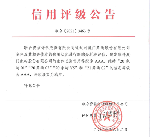 6月2日,權威評級機構聯合資信評估股份有限公司(以下簡稱“聯合資信”)出具《廈門象嶼股份有限公司公開發行公司債券2021年跟蹤評級報告》,維持