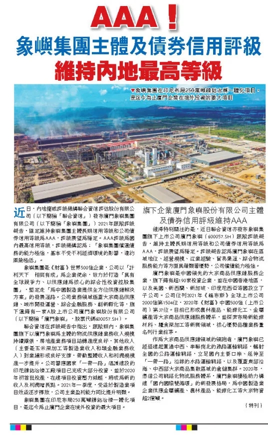 近年來,象嶼積極響應國家“一帶一路”倡議,在國際市場開拓、跨境供應鏈服務、國際化運營團隊培育等方面不斷發(fā)力,象嶼國際化程度不斷提升引起了國際資本市場的廣泛關注。昨天,《大公報》、《香港經(jīng)濟日報》、《大公網(wǎng)》、《經(jīng)濟通》等多家港媒,發(fā)文聚焦廈門象嶼集團有限公司及旗下上市企業(yè)廈門象嶼股份有限公司主體及債券信用評級均維持國內最高等級AAA,并詳細圍繞評級報告介紹了象嶼的業(yè)務板塊和發(fā)展前景。
