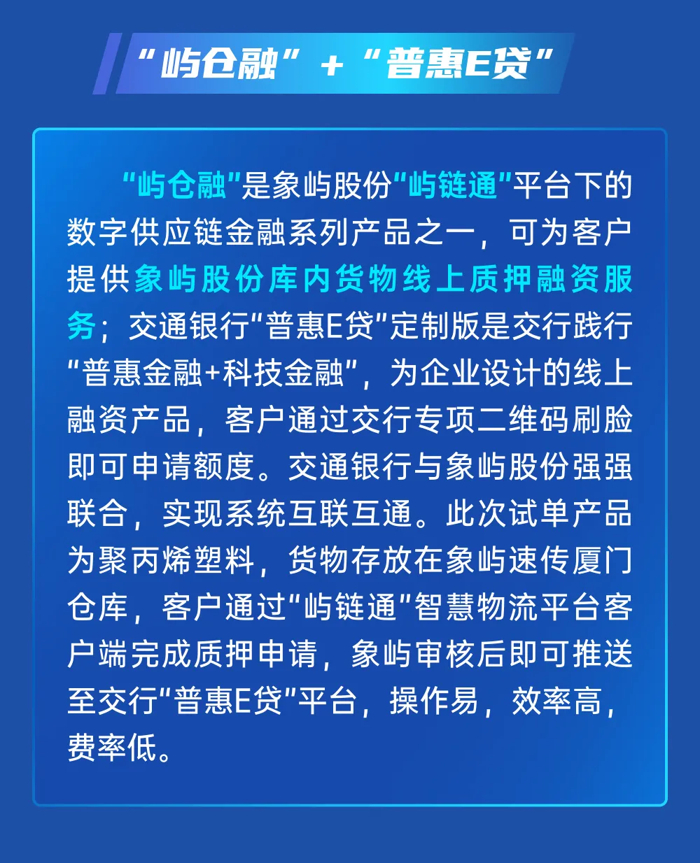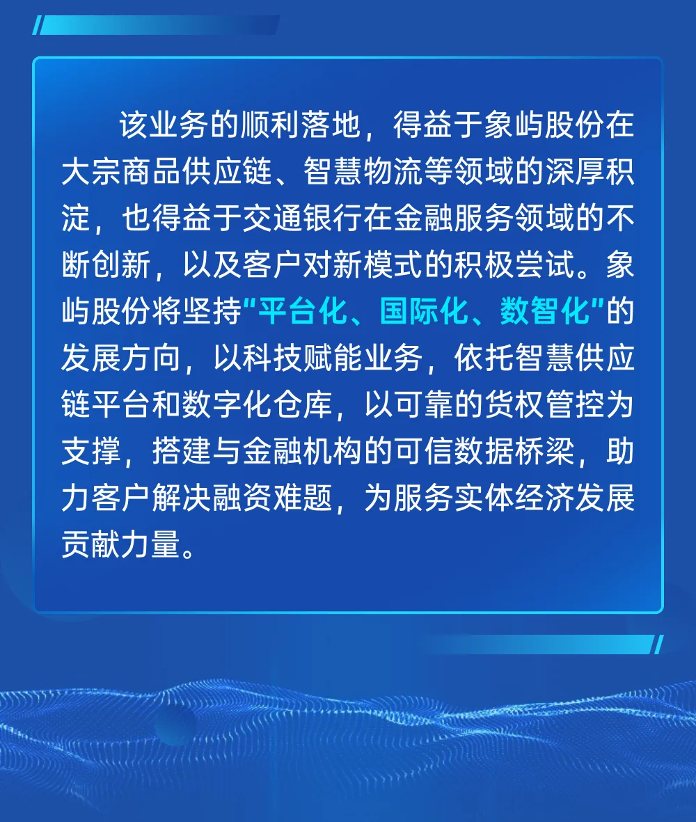 象嶼“嶼倉融”助力交行“普惠E貸”數字倉單質押融資業務成功落地!