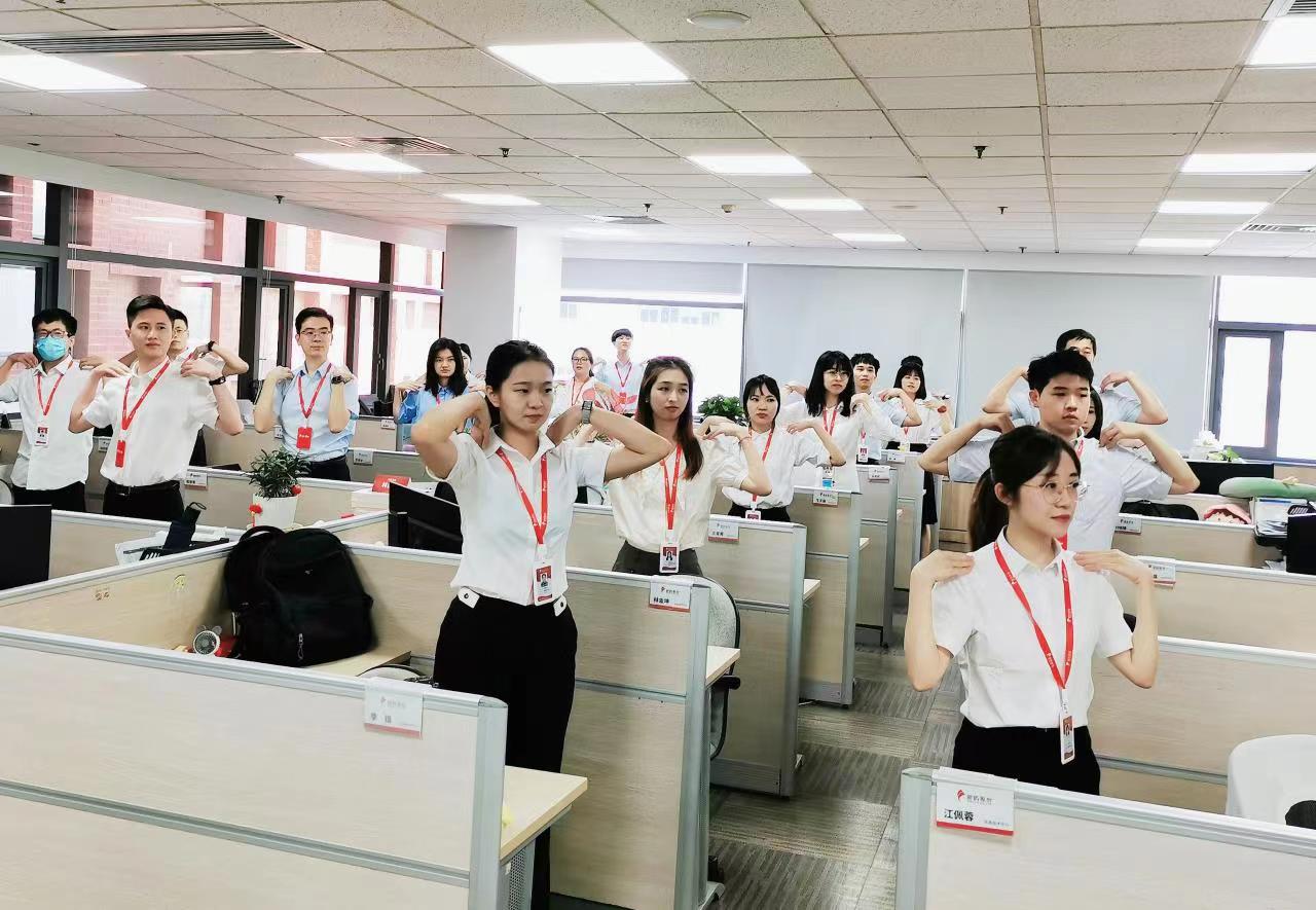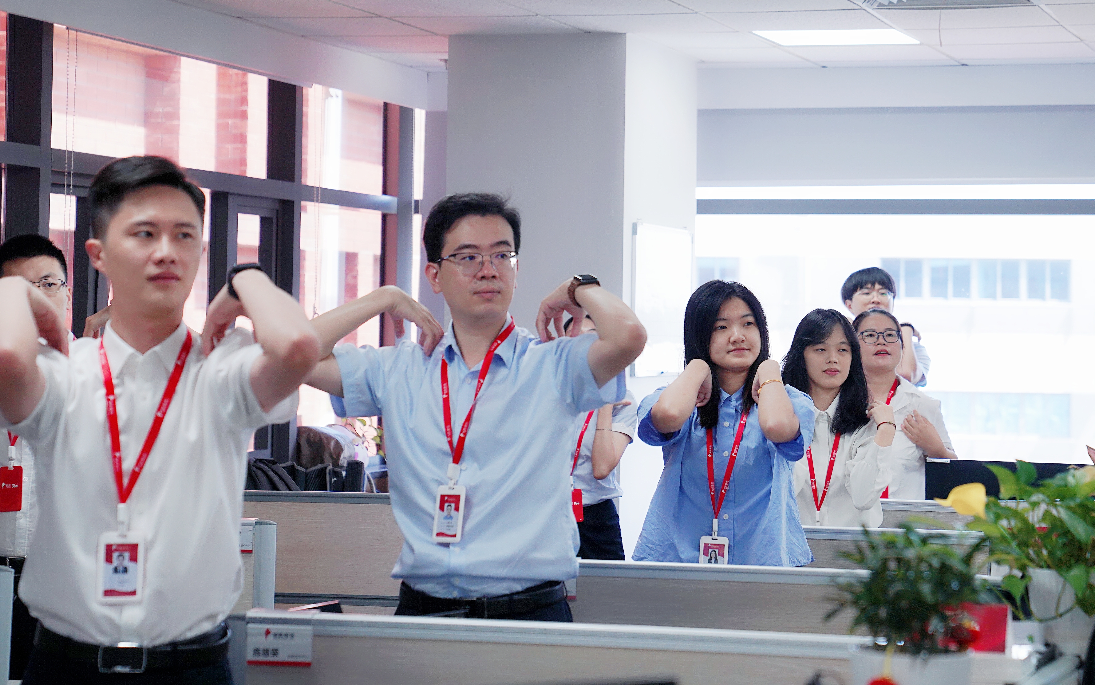 早上十點半,隨著律動音樂的響起,大家紛紛從工位上起身,加入到了活力工間操隊伍中。一二三四,五六七八,二二三四,五六七八……頭部運動、體側運動、擴胸運動、體轉運動……每一個節拍,每一個動作,無不體現著象嶼人的朝氣蓬勃和積極向上!