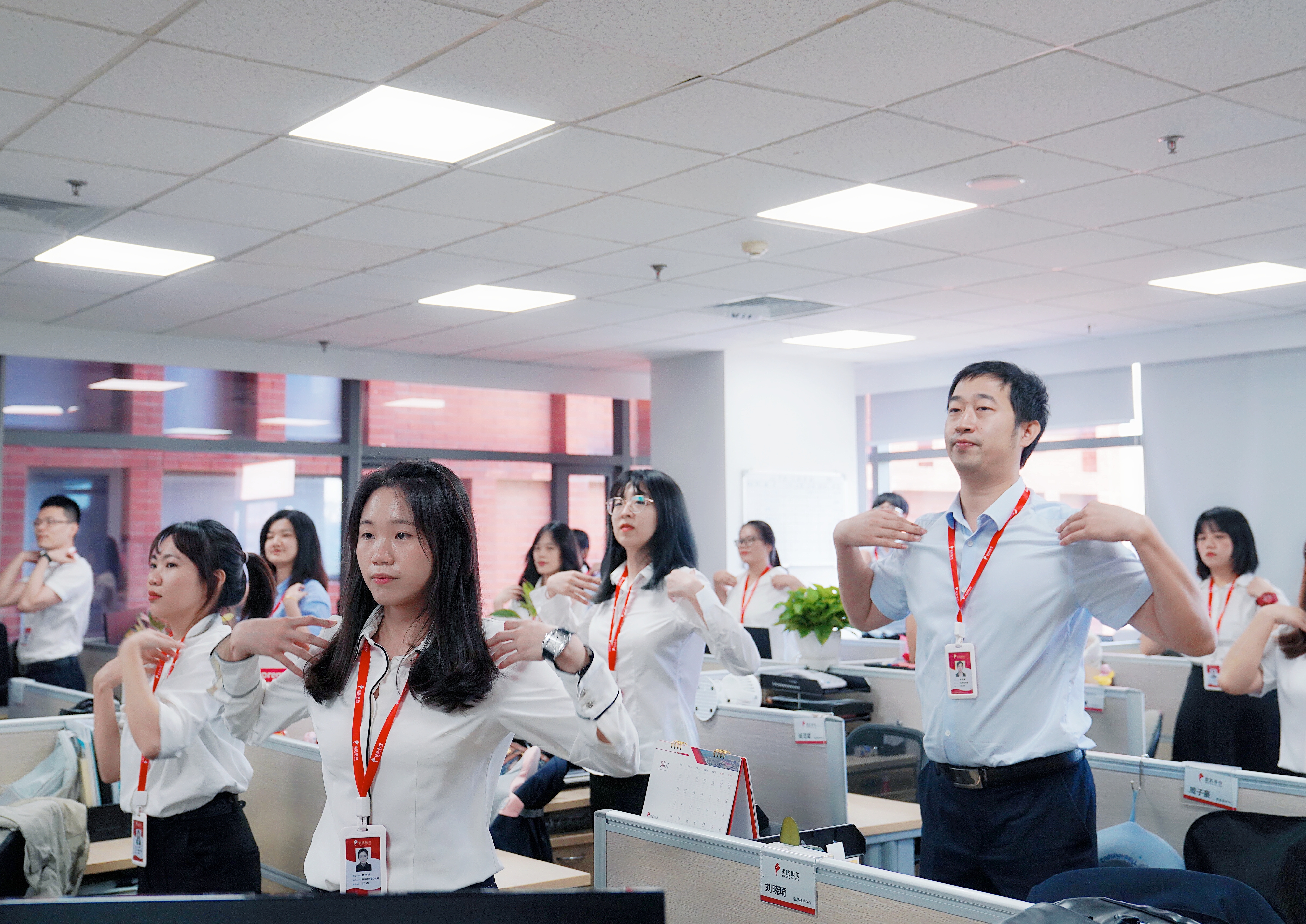 簡單易學的工間操緩解了大家的工作壓力,放松了身心,起到了良好的鍛煉效果。通過短短幾分鐘的運動時間,調動了大家參與全民健身的積極性,提振精氣神,讓大家“元氣滿滿”投入到后續的工作當中!簡單有效的健身方式,你還在等什么?趕緊一起來跳工間操吧!
